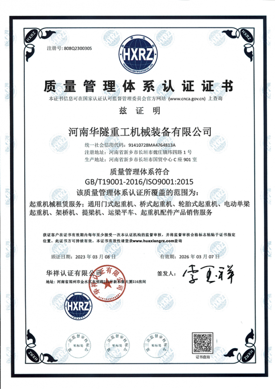 河南華隧重工機械裝備有限公司主要從事通用門式起重機、橋式起重機、電動單梁起重機,輪胎式起重機、架橋機、提梁機、遠梁平車、鋼絲繩電動萌蘆、卷揚機、起重配件制造、銷售:起重機械租賃、安裝和維修,起重設備園收,機械設備維修,鋼結構工程承包,橋梁工程及技術咨淘服務,銷售五金制品、機電設備:建設工程監理,建設工程設計,各類工程建設活動,建筑勞務分包,建筑物折除作業,施工作業,工程管理服務,土石方工程施工,裝如發運?! 」疽淹ㄟ^IS0國際質量、環境、健康與安全三合一標準認證,特種設備制造許可證和特種設備安裝改造維修許可證。擁有完熟的質量管理體系。嚴格的管理制度,強大的生產能力和先進的檢測手段,在保證產品質量的同時,也具備了極強的市場競爭力。  公司堅持科技創新為理念,產品質量為核心,注重信譽,建立了減信可靠、快捷、思速。便利周到的售后服務網絡。  我們擁有的技術專家和技術服務隊伍為客戶提供充善的售前技術支持和全天候的售后服務體系,讓您無后顧之憂,享受一站式的超值服務。  “華隧重工,伴您成功“是華隧重工永遠的宗指,真被的希望與各界朋友攜手并進。共創輝準!